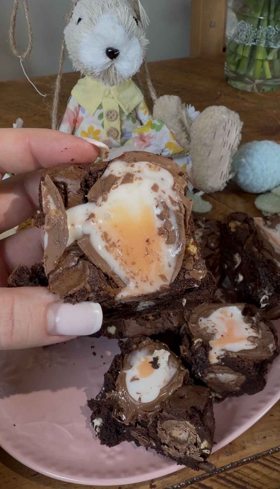 They’ll soften and sink in slightly, giving you that picture‑perfect, gooey Easter brownie look.