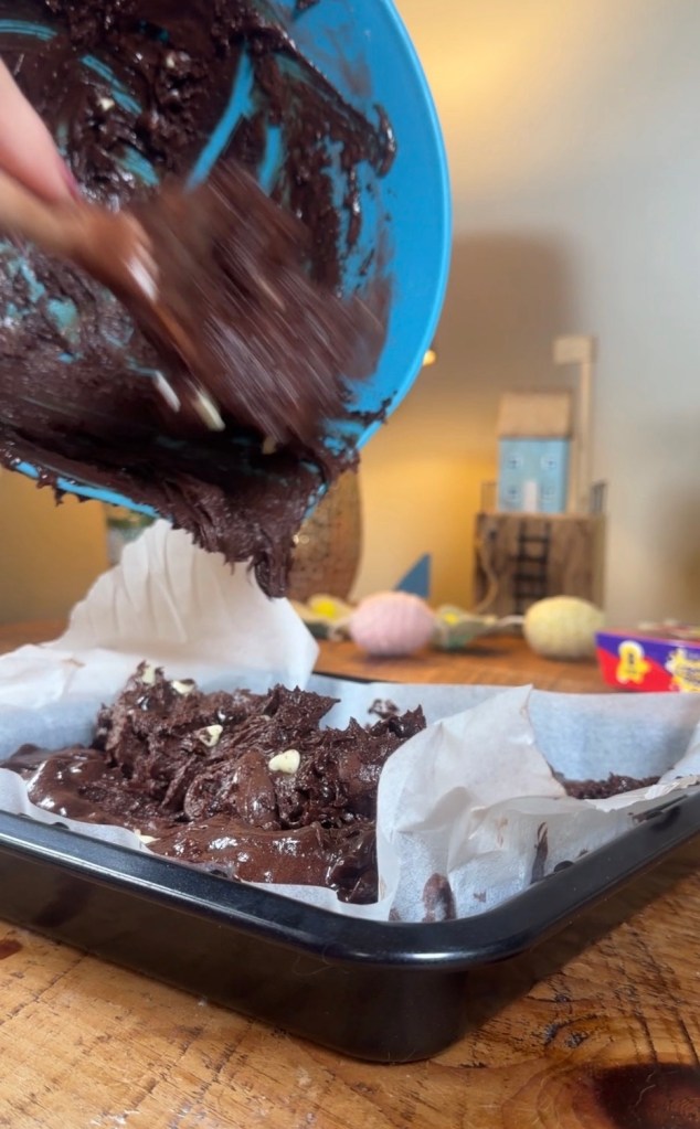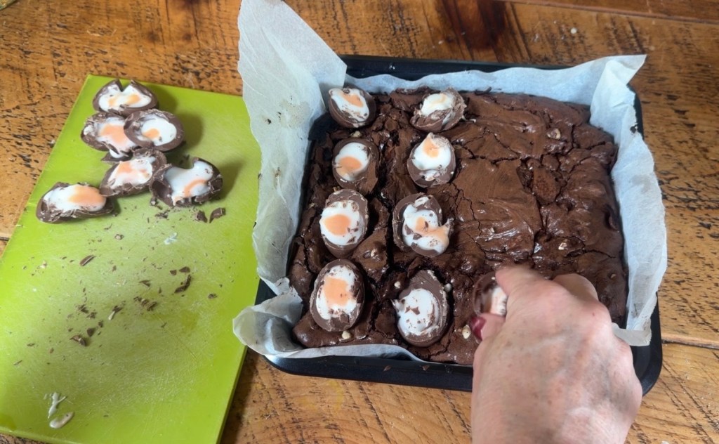 When the brownies come out of the oven, gently press the halved Creme Eggs onto the top.
