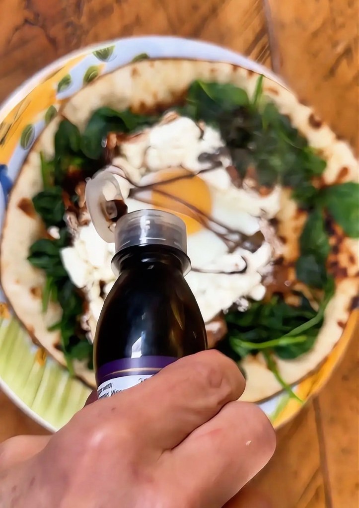 Slide it all onto your tortilla, drizzle with balsamic glaze, fold it up, and that’s breakfast done! 🥙
