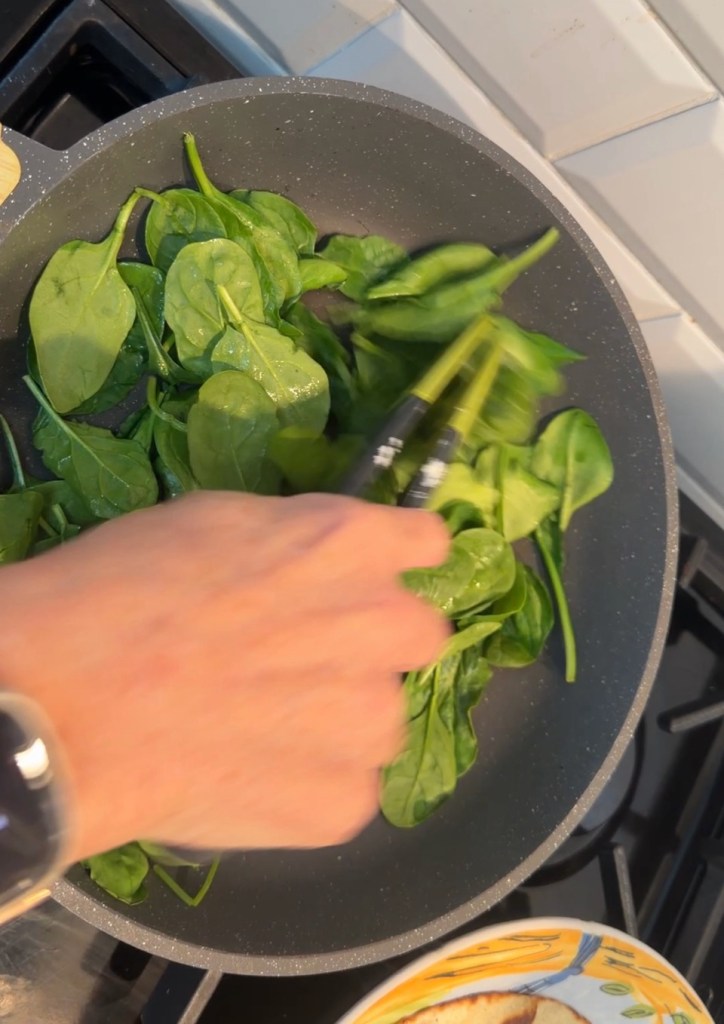 Heat a little avocado oil in a pan and warm your tortilla for about a minute each side, just to soften it up. Take it out, then throw in your spinach — it’ll wilt in no time.