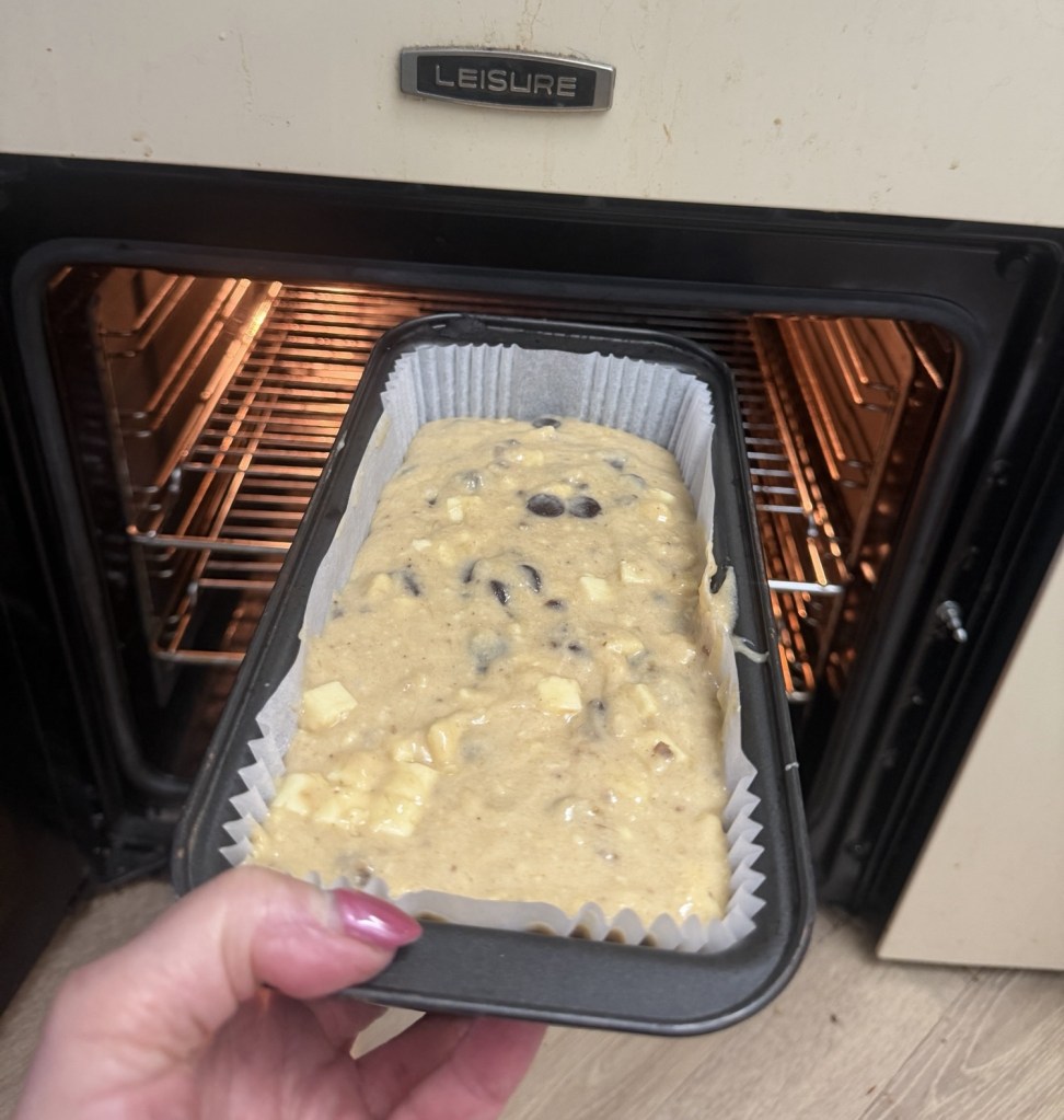 Spoon the mixture into your prepared loaf tin. Use the back of a spoon or a spatula to level the surface so it bakes evenly and looks neat once it’s risen.