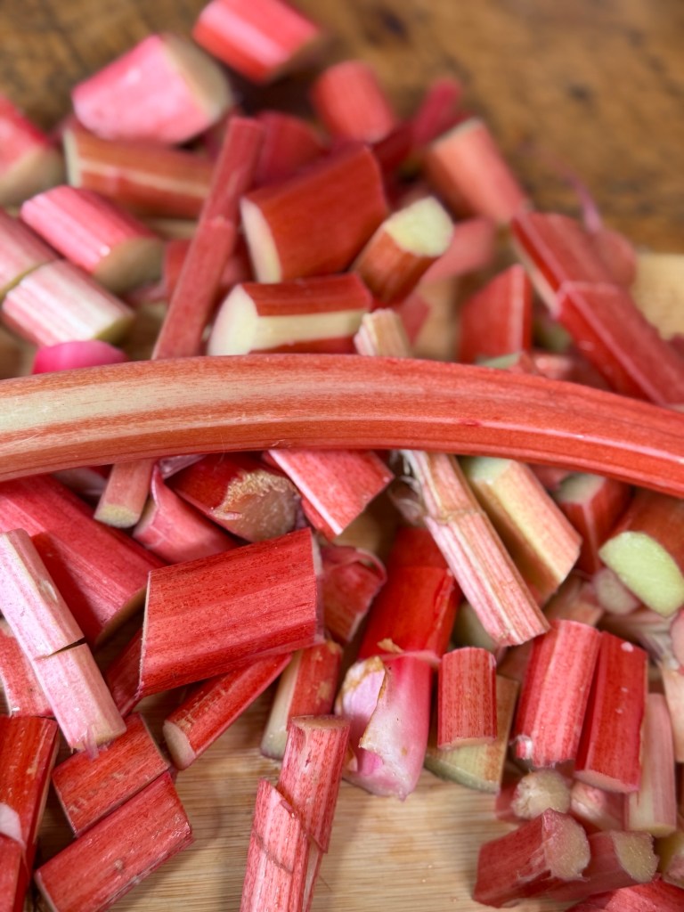 I start with fresh rhubarb, trimmed and chopped into chunky pieces. The colour always looks so pretty – all those pink and green stalks – and it smells amazing even before it hits the heat.