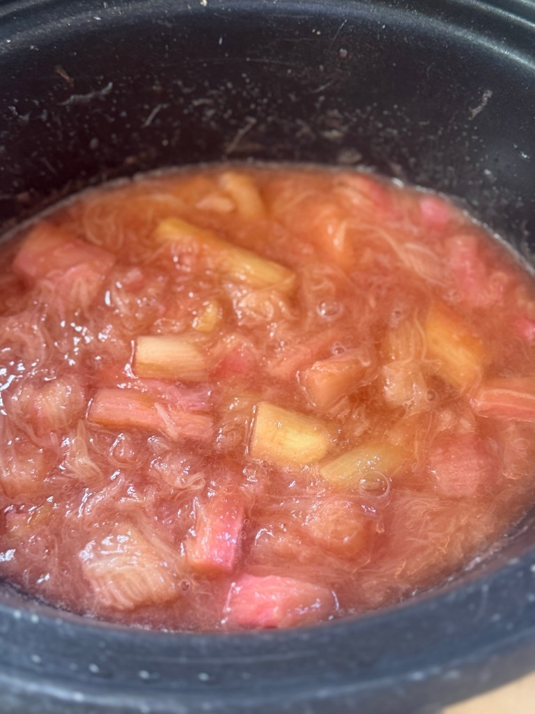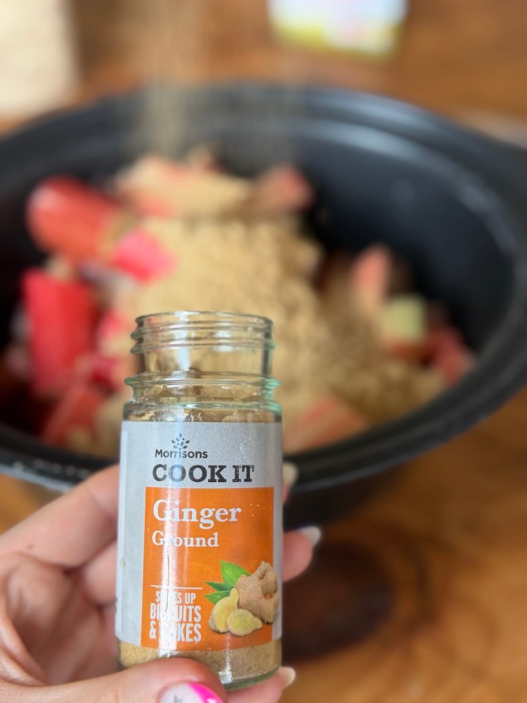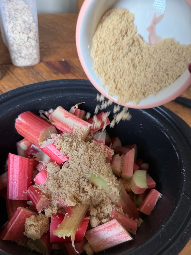 Instead of putting raw rhubarb straight under the crumble, I cook it first. I pop it into the slow cooker with a generous handful of light brown sugar and a good teaspoon or two of ground ginger.