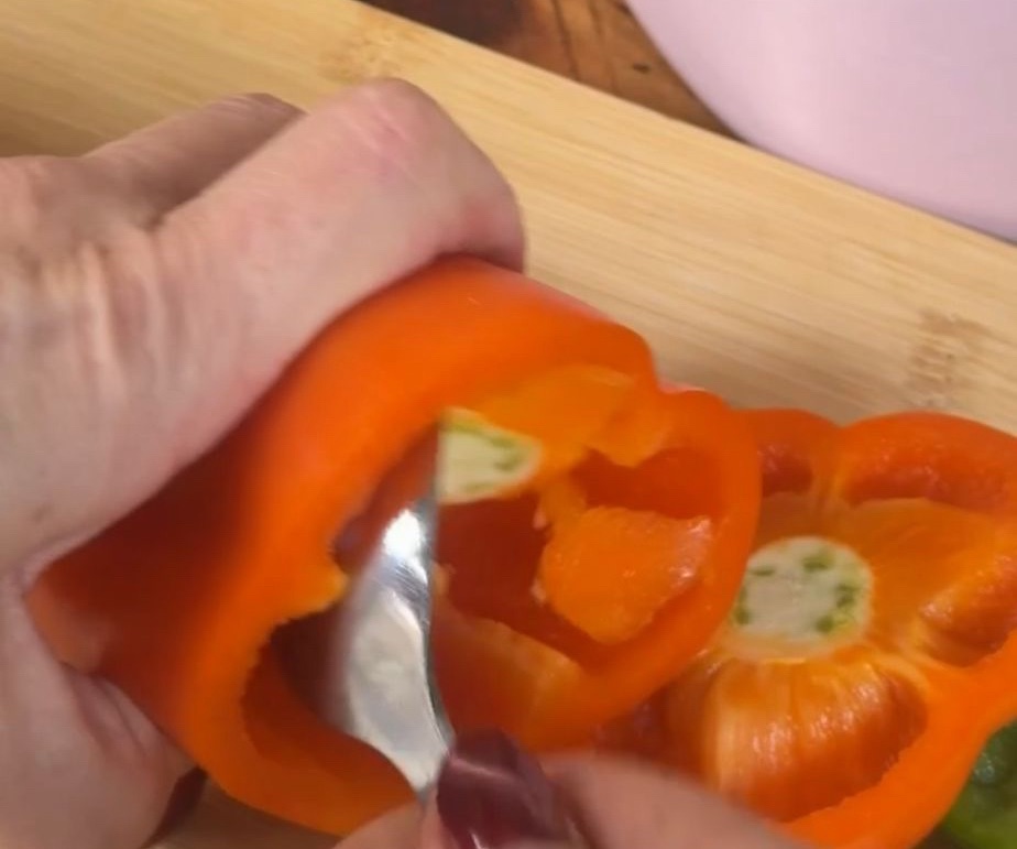 Slice the tops off the peppers and pull out the seeds and white bits inside.