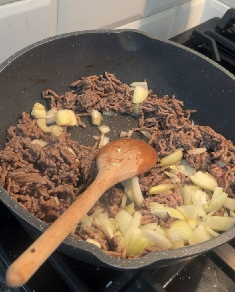Add the beef mince, break it up with a spoon, and cook until it’s browned all over and no pink remains.
