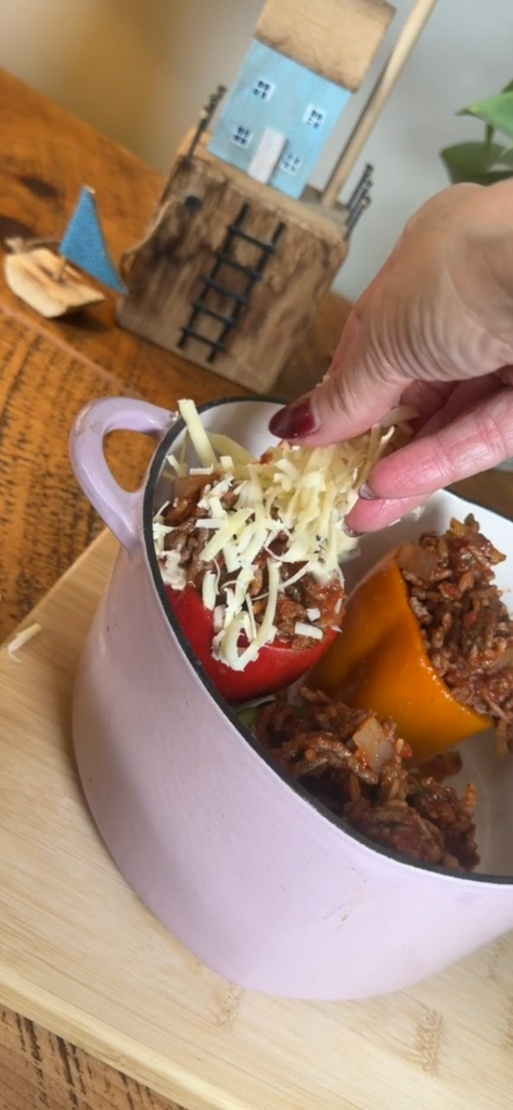 Sprinkle the remaining grated cheese generously over the tops of the stuffed peppers.