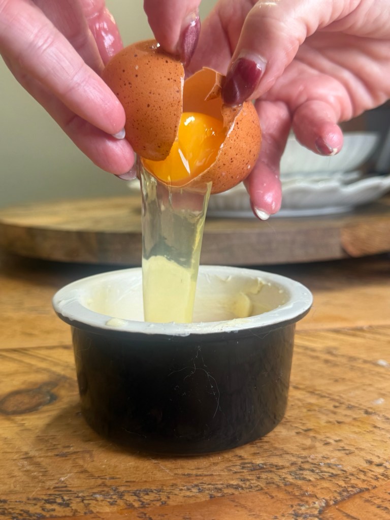 Lightly butter your ramekins so the eggs don’t stick and the edges stay lovely and soft.