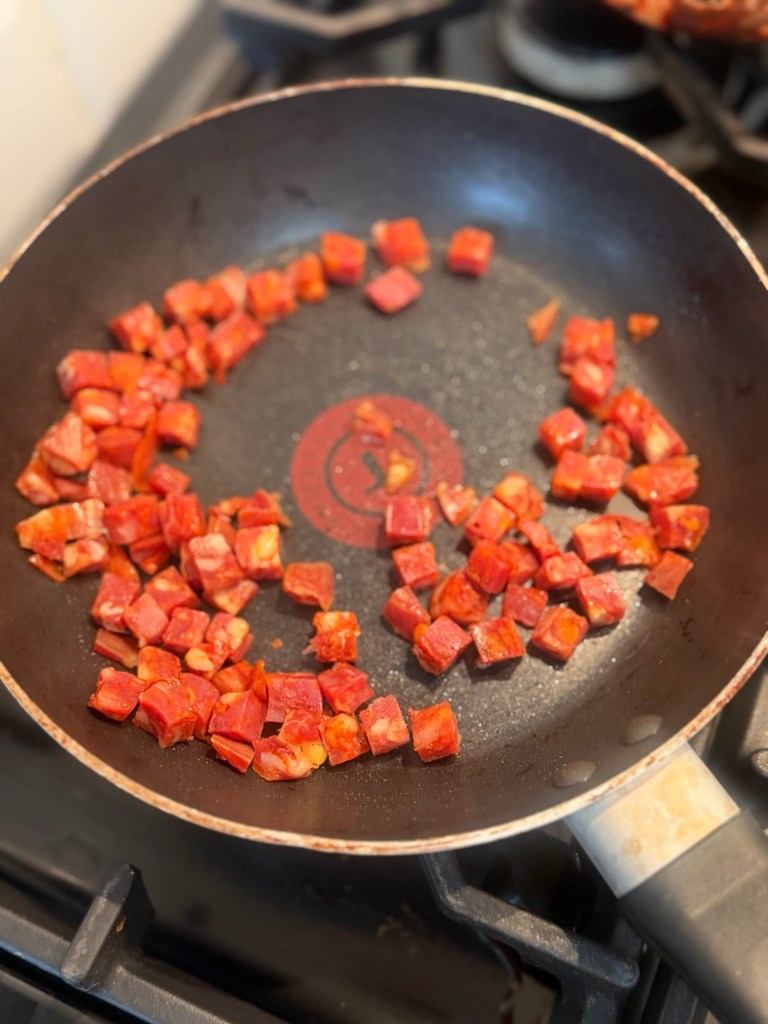 Add the diced chorizo to a dry frying pan over medium heat. Cook for a few minutes until it starts to crisp and releases its oil, then take it off the heat.