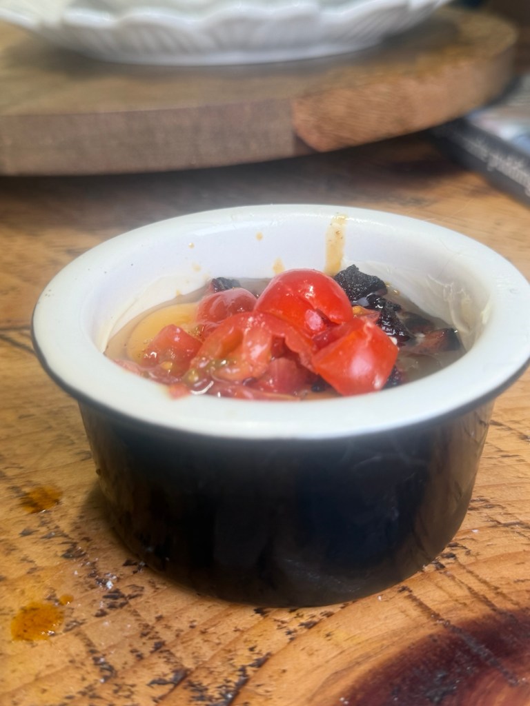Scatter the chopped cherry tomatoes over the egg, then spoon the fried chorizo on top, making sure you get some of that flavourful oil too.