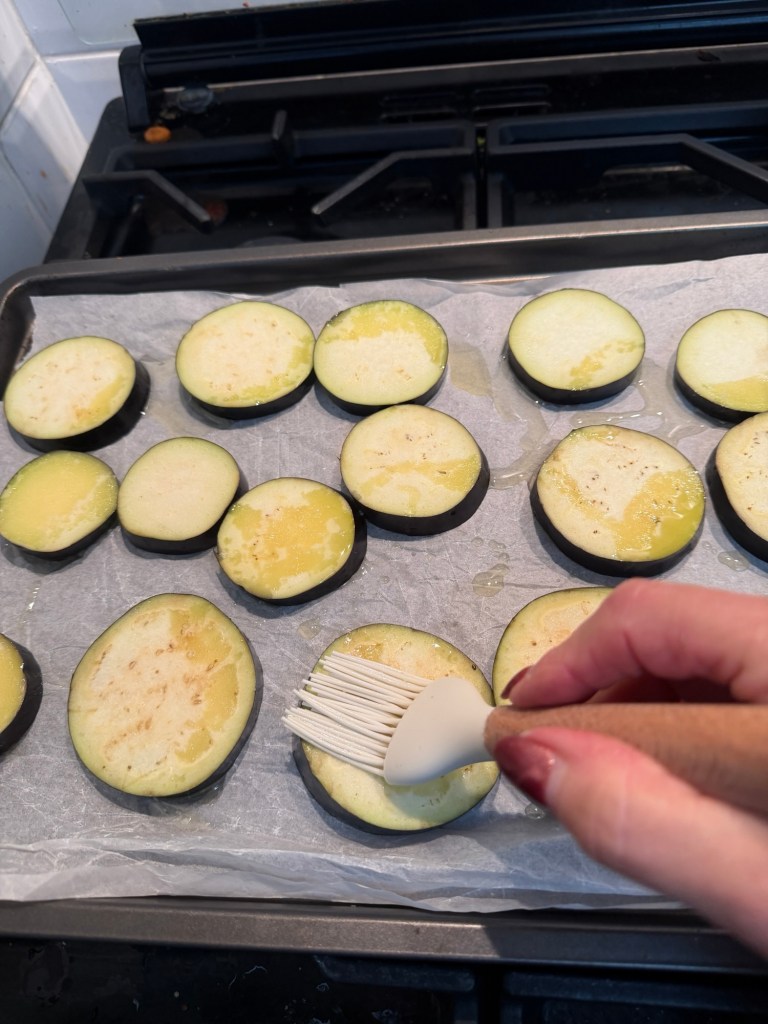 Preheat your oven to 220°C / 200°C fan / gas 7. Line one or two baking trays with baking paper if you want easier washing up. Lay the aubergine slices out in a single layer, brush (or drizzle and rub) with olive oil on both sides, and season with salt and pepper.