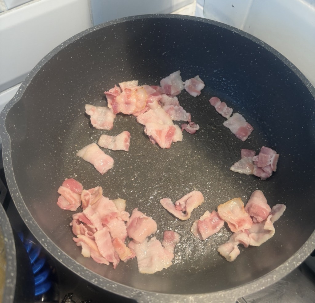 • Add the chopped streaky bacon to a cold pan, then put it on medium heat. Starting it cold helps the fat render out slowly and makes everything extra crisp.