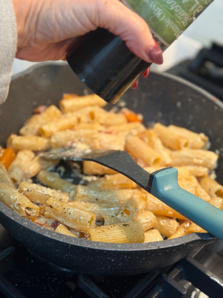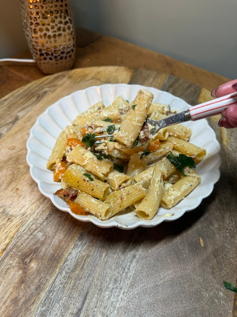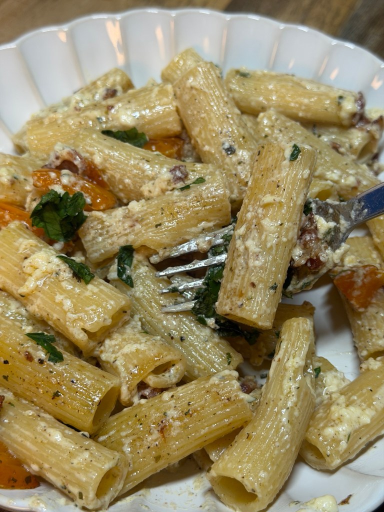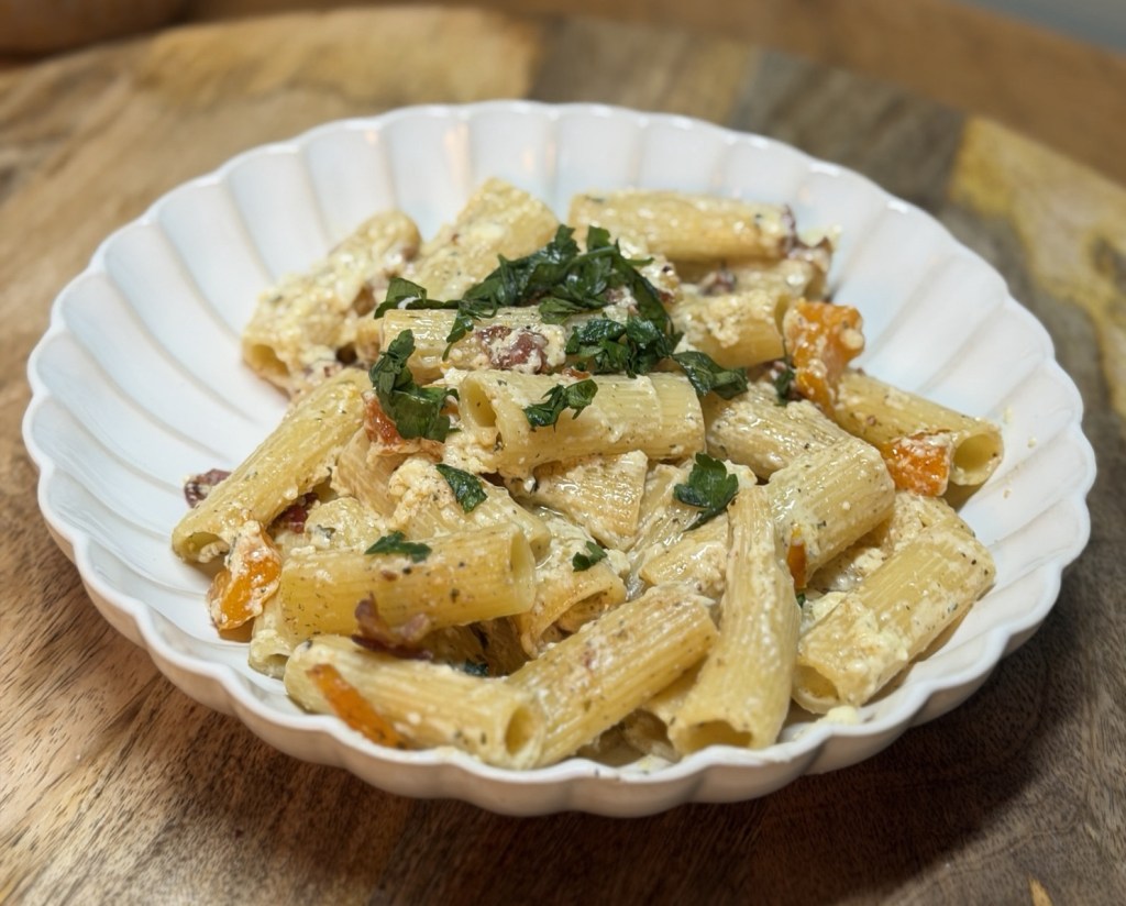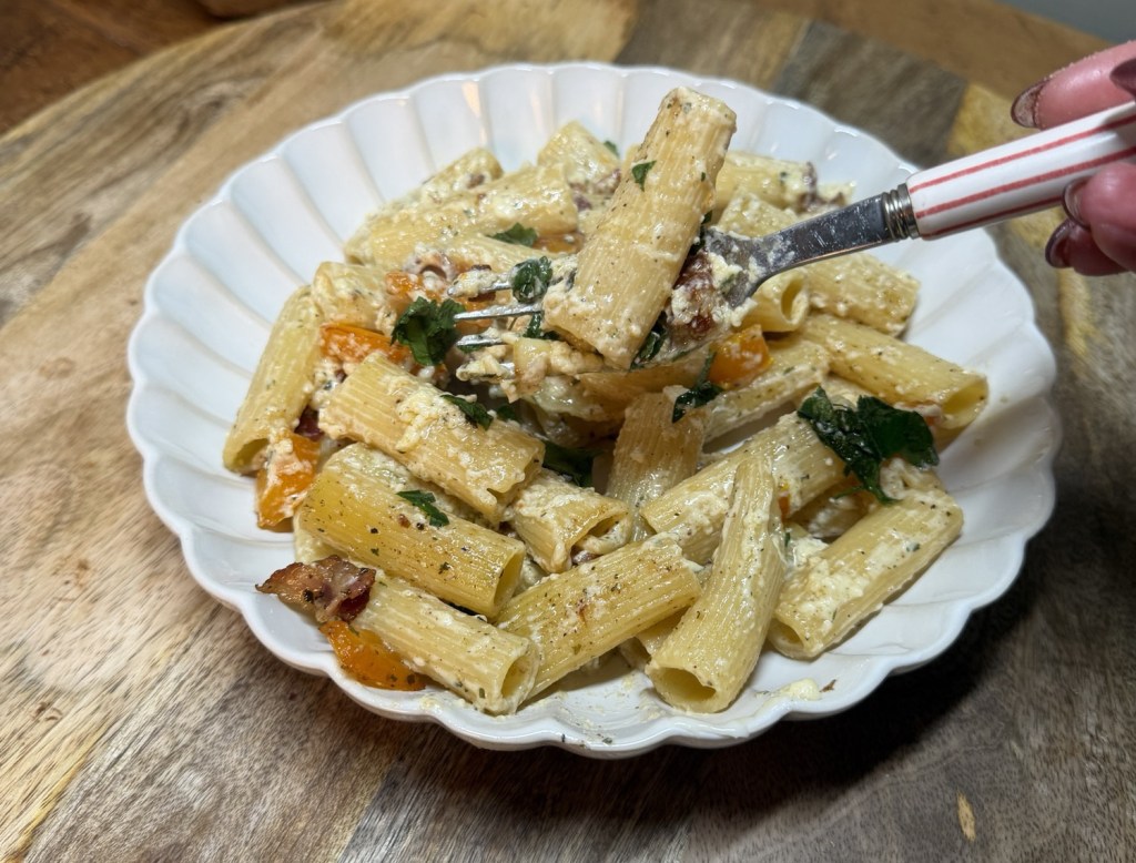 Spoiler: you can make the creamiest, boujiest mid‑week pasta that tastes like carbonara’s glam cousin who moved to Italy, discovered goat’s cheese and never looked back.