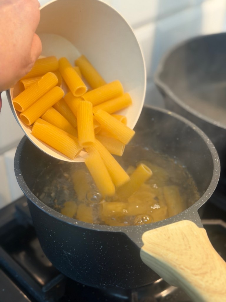 Bring a big pan of well‑salted water to the boil – it should taste like the sea, not a faintly disappointed puddle. Add your pasta and cook it until just al dente. Don’t walk away “just to check TikTok” unless you’ve set a timer.
