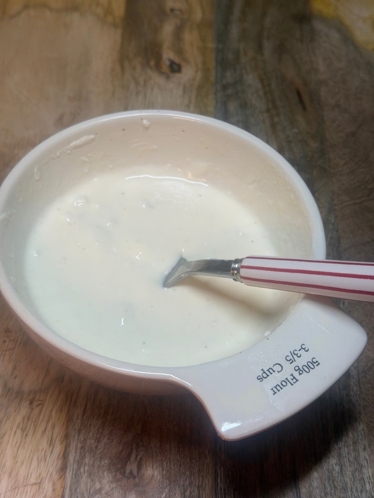 You want a smooth, pourable mixture – not too thick, not too runny. Think “luxurious single cream”.