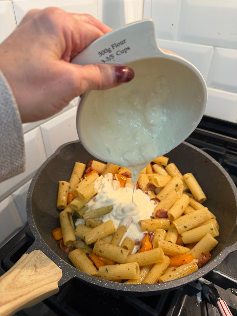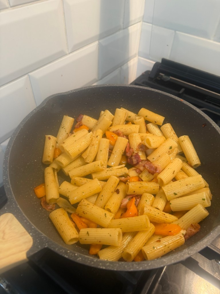 • Add your hot drained pasta into the pan with the peppers and bacon. Toss everything together so the pasta is well coated in the bacon fat and pepper juices.