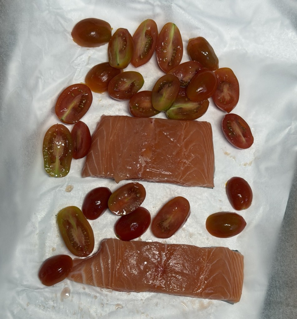 Start by preheating your oven to 160c . Arrange the cherry tomatoes and salmon fillets on a baking tray on foil season well, and drizzle over half of the olive oil.