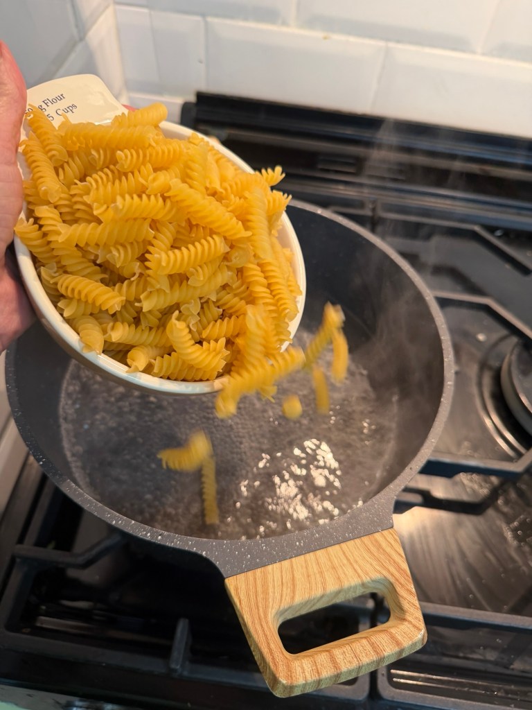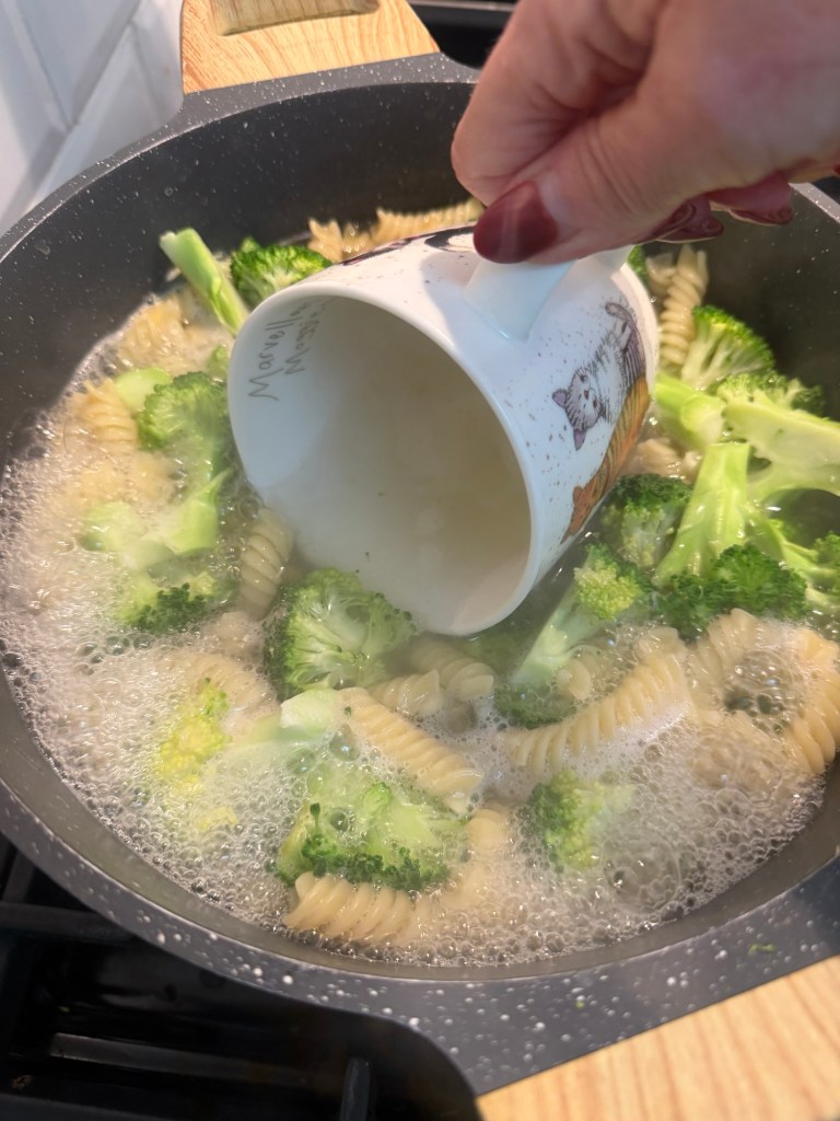 Before draining, scoop out a large mug of the pasta water—this makes all the difference to your sauce.