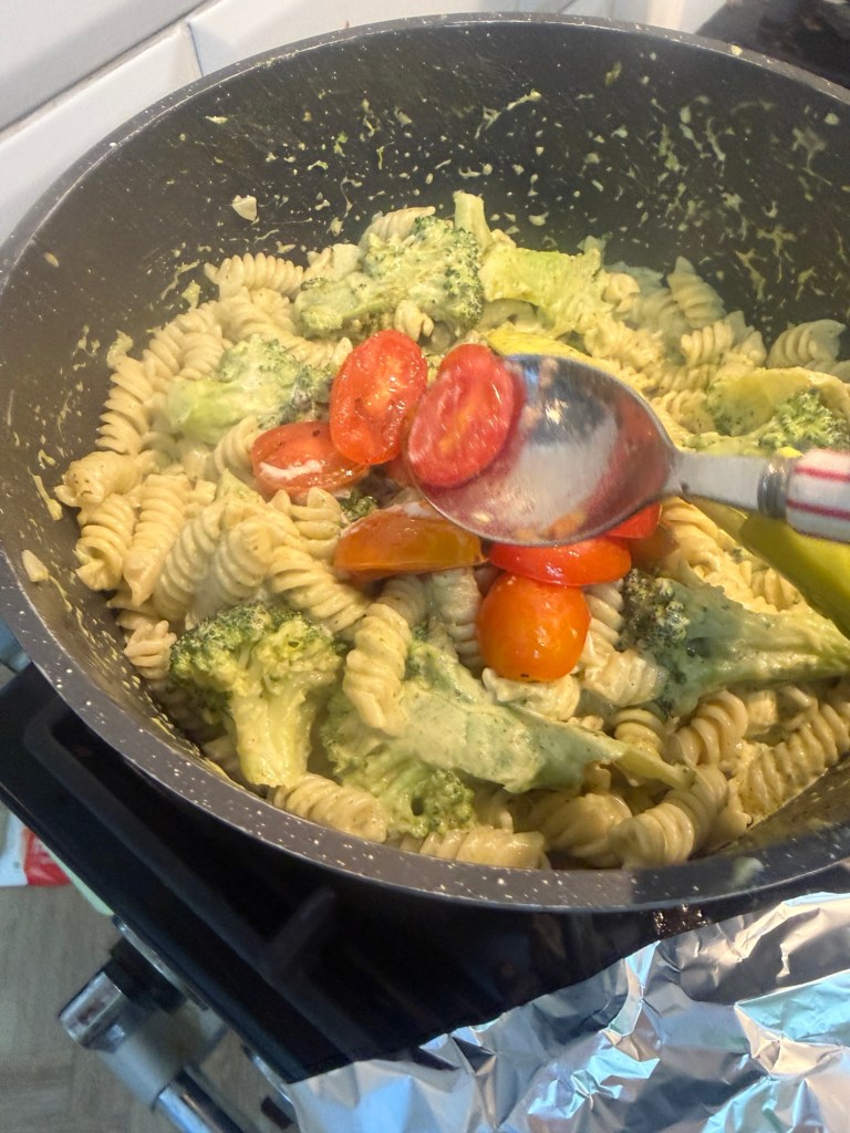 Return the pasta and broccoli to the pan, then stir in the pesto, mascarpone, and half of the roasted tomatoes.