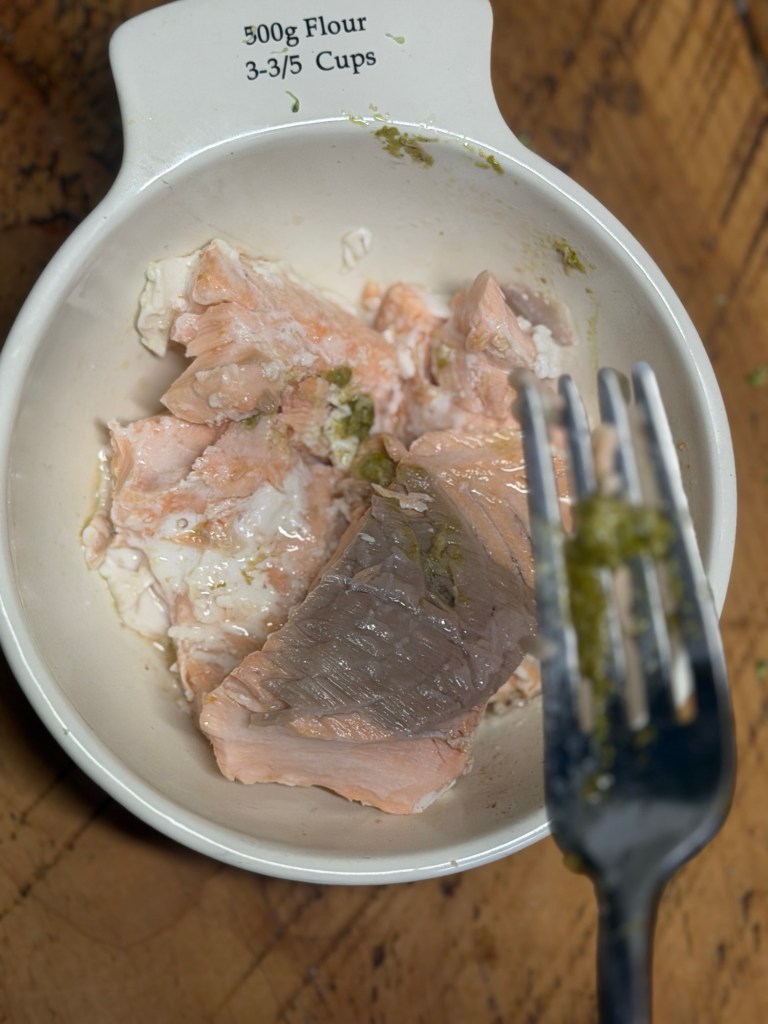 Flake in the salmon, removing the skin, and gently fold everything together so you keep those nice chunky pieces.