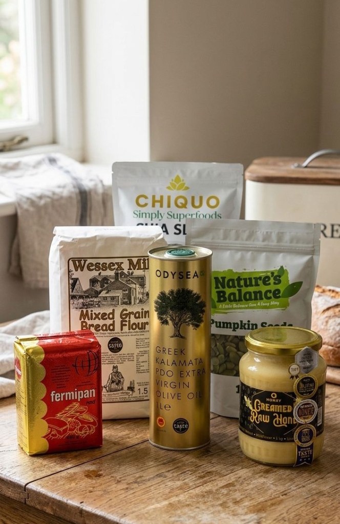 I’ve been making mine with pumpkin seeds and chia seeds, and I absolutely love the texture they give. It turns a simple loaf into something a bit more special. Pumpkin seeds add a lovely nutty flavour and a little crunch. They also contain protein, magnesium, potassium, zinc, iron and healthy fats. I like that they make the bread feel more filling too. Chia seeds are tiny, but they’re such an easy way to add extra goodness. They contain fibre, omega-3 fatty acids, iron, calcium and antioxidants. They disappear nicely into the loaf, so you’re getting the benefit without changing the bread too much. For a lighter bread I use a tablespoon or so of powdered milk which makes it a little softer. I’ve also been using raw whipped honey instead of refined white sugar. It gives the bread a gentle sweetness and a lovely flavour. Honey is still a sugar, so I wouldn’t call the bread sugar-free, but I do like that I’m not using refined white sugar. Raw honey is less processed than many standard sweeteners and can contain natural antioxidant compounds.