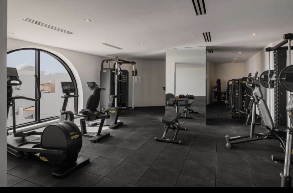 There is a small but well equipped gym with cardio machines, free weights and machines. Towels and water are provided
